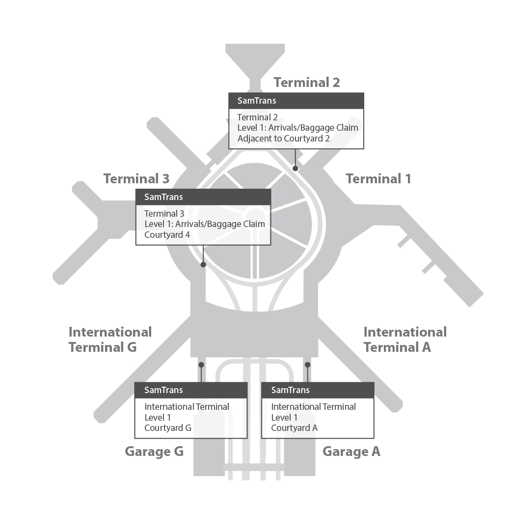 SamTrans Route 292 stops directly at the Airport terminals. Route EPX and 142 stop at the Rental Car Center and can be reached from the terminals by using the AirTrain blue line. Routes 292 also stop along North McDonnell Road and operate during the day and the evening.